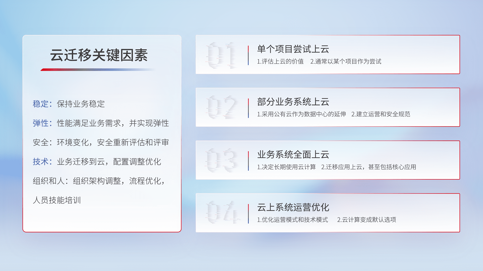 结合实际业务,,,从规划设计、、、云平台选型、、云原生改造、、数据迁移、、、、集成交付,,,迁移全过程为客户识别最佳上云路径,,,做好风险识别管理,,,设计网络架构、、身份权限、、、安全审计合规、、操作审计、、日志审计、、、、监控告警策略、、、多站点容灾设计等,,,,对云上基础设施进行整体规划,,提升IT治理水平,,以满足弹性、、高可用、、高性能的需求。。